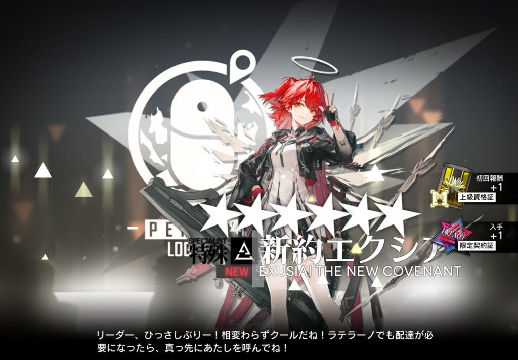新約エクシアも追加 アークナイツ X Facebook はてブ LINE Pinterest コピー 2025.11.03 Screenshot ちょっと前に引けたんだけど、新約エクシアも引けた。 召喚カード3枚のうち1まいでひけたのはらっきーだった!!しばらく運ないだろうけど😢